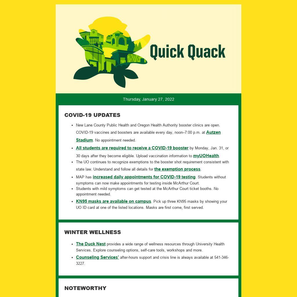 The UO continues to recognize exemptions to the booster shot requirement consistent with state law. Understand and follow all details for the exemption process.