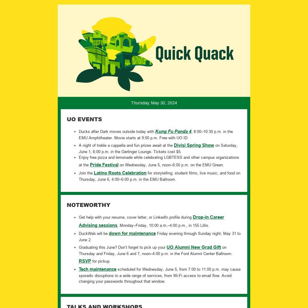 - DuckWeb will be down for maintenance Friday evening through Sunday night, May 31 to June 2.