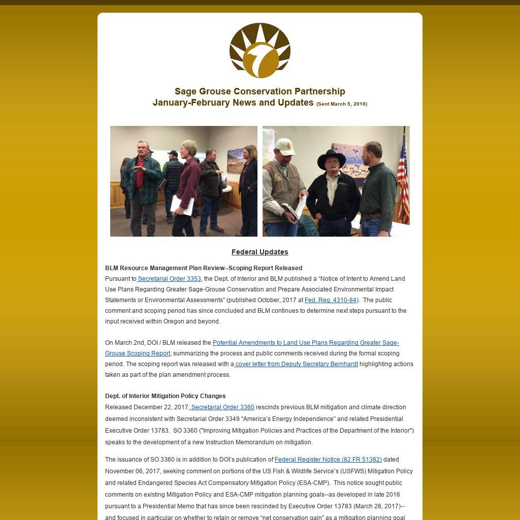 BLM Resource Management Plan Review--Scoping Report Released Pursuant to Secretarial Order 3353, the Dept. of Interior and BLM published a “Notice of Intent to Amend Land Use Plans Regarding Greater Sage-Grouse Conservation and Prepare Associated Environmental Impact Statements or Environmental Assessments” (published October, 2017 at Fed. Reg. 4310-84). The public comment and scoping period has since concluded and BLM continues to determine next steps pursuant to the input received within Oregon and beyond. Dept. of Interior Mitigation Policy Changes Released December 22, 2017, Secretarial Order 3360 rescinds previous BLM mitigation and climate direction deemed inconsistent with Secretarial Order 3349 “America’s Energy Independence” and related Presidential Executive Order 13783. SO 3360 ("Improving Mitigation Policies and Practices of the Department of the Interior") speaks to the development of a new Instruction Memorandum on mitigation. The issuance of SO 3360 is in addition to DOI’s publication of Federal Register Notice (82 FR 51382) dated November 06, 2017, seeking comment on portions of the US Fish & Wildlife Service’s (USFWS) Mitigation Policy and related Endangered Species Act Compensatory Mitigation Policy (ESA-CMP). This notice sought public comments on existing Mitigation Policy and ESA-CMP mitigation planning goals--as developed in late 2016 pursuant to a Presidential Memo that has since been rescinded by Executive Order 13783 (March 28, 2017)--and focused in particular on whether to retain or remove “net conservation gain” as a mitigation planning goal within the USFWS’s mitigation policies. The public comment period has been closed since January and DOI’s next steps remain to be determined.