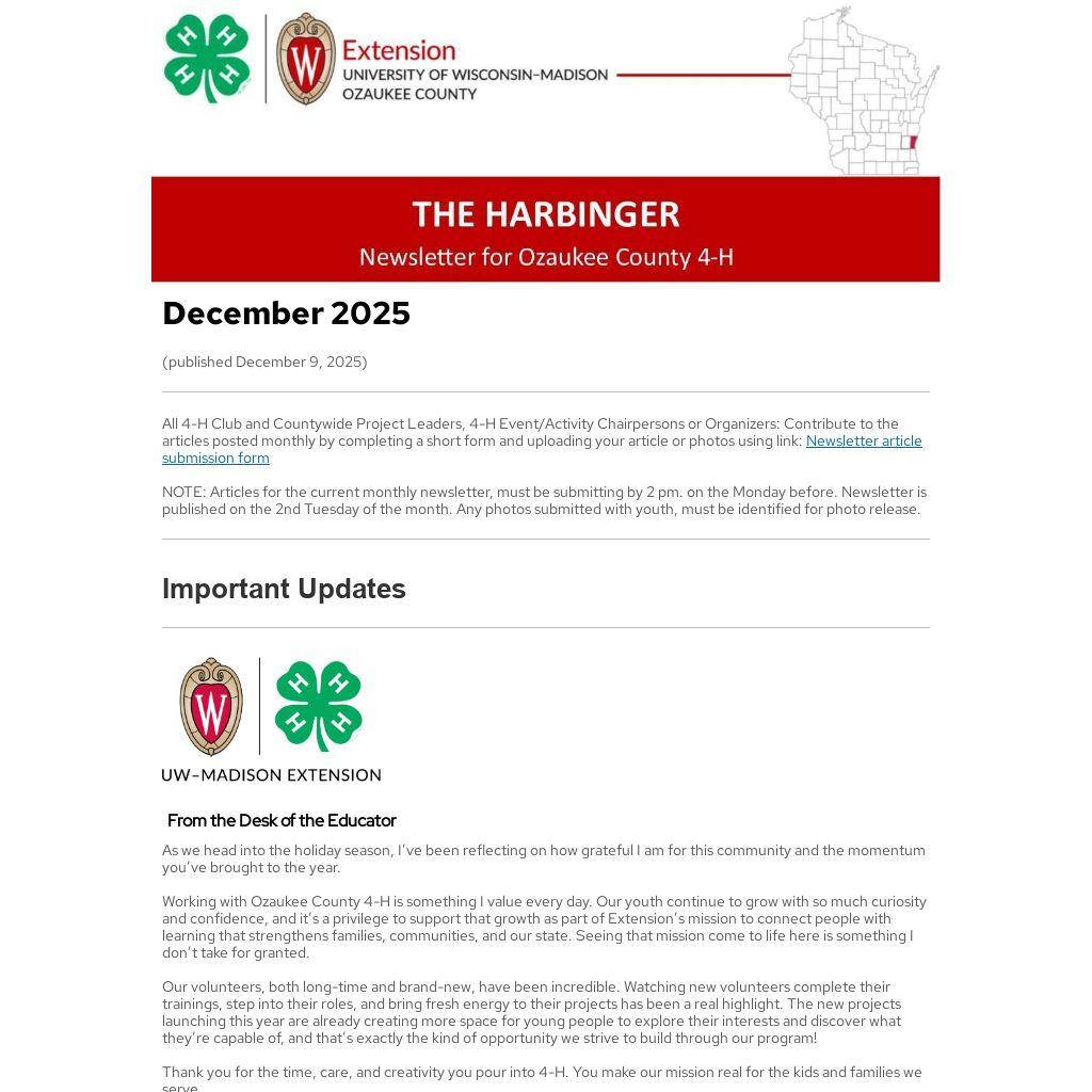 WI 4-H Ambassador Teams Application: December 15. Ambassadors get unique opportunities to represent Wisconsin 4-H, develop leadership skills, and contribute to statewide programming. Apply to join the Arts, Leadership, or Agriculture Ambassadors depending on what inspires you most. Youth must be in grades 9-12 are invited to apply until December 15th. Learn more and apply here at the WI 4-H Ambassador Team webpage.