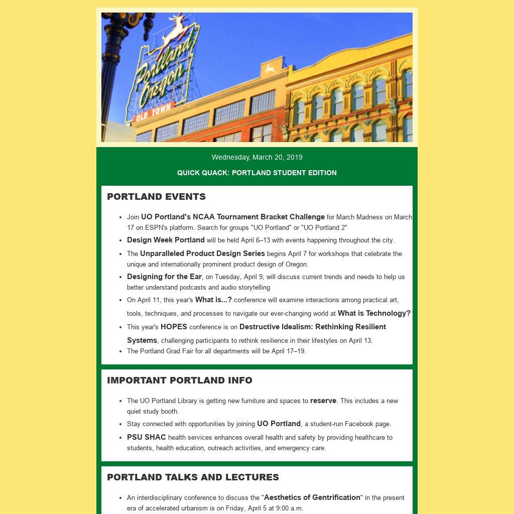 Stay connected with opportunities by joining UO Portland, a student-run Facebook page.