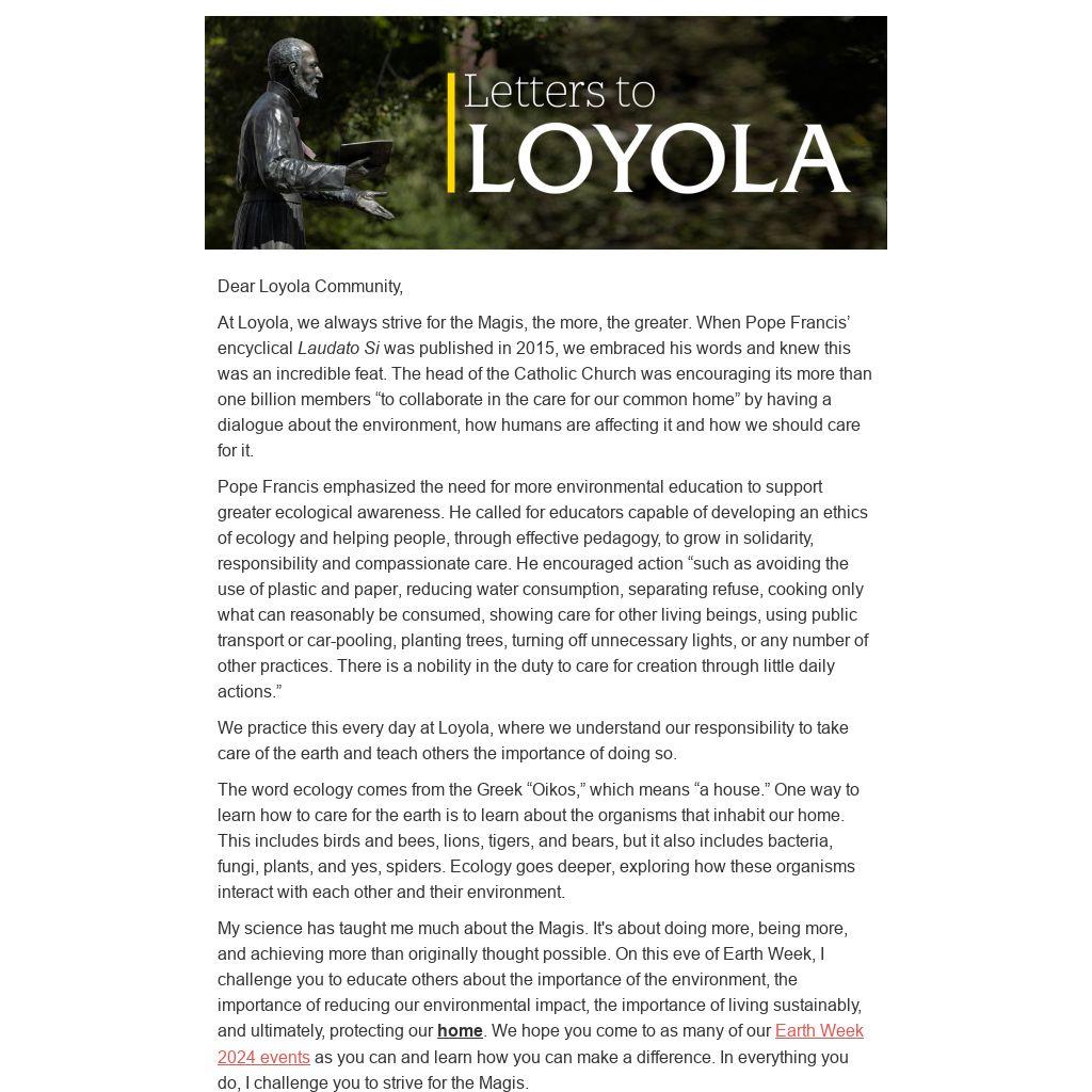 My science has taught me much about the Magis. It's about doing more, being more, and achieving more than originally thought possible. On this eve of Earth Week, I challenge you to educate others about the importance of the environment, the importance of reducing our environmental impact, the importance of living sustainably, and ultimately, protecting our home. We hope you come to as many of our Earth Week 2024 events as you can and learn how you can make a difference. In everything you do, I challenge you to strive for the Magis.