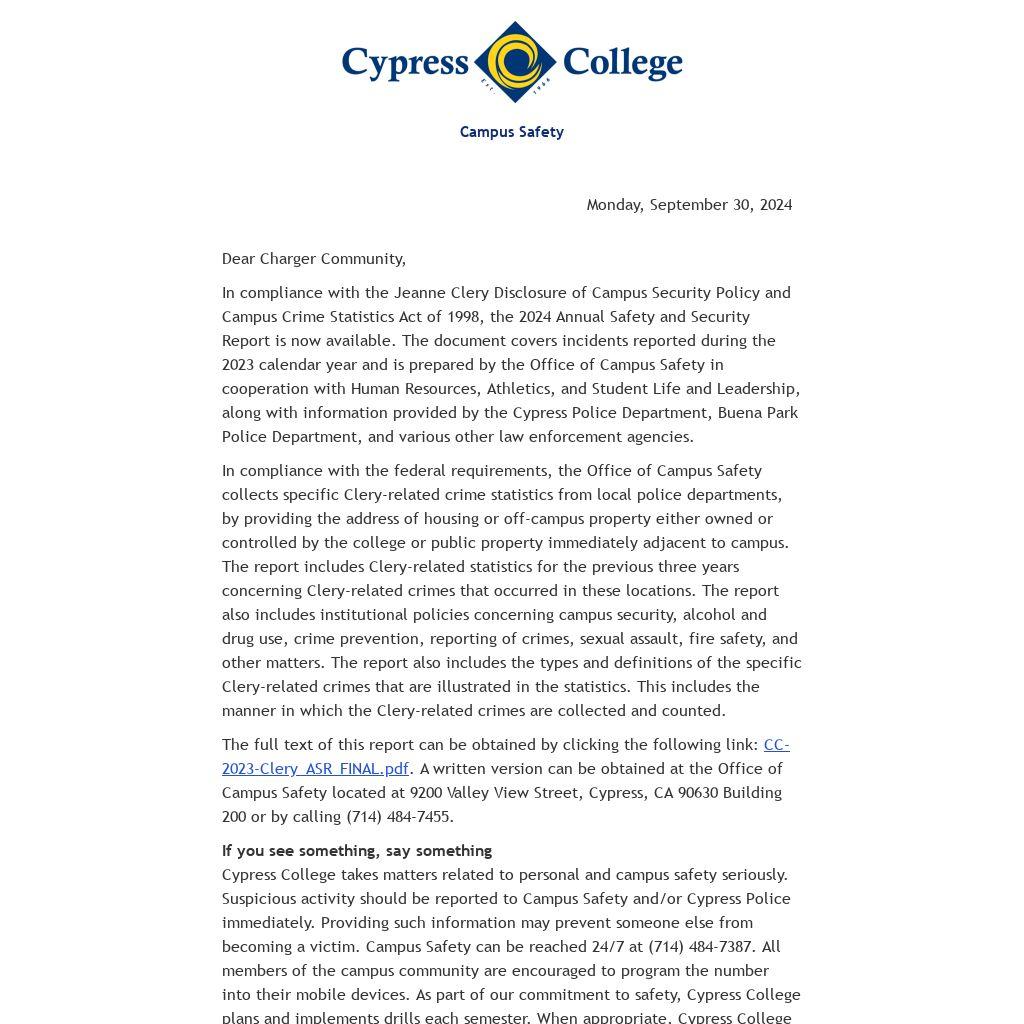 In compliance with the Jeanne Clery Disclosure of Campus Security Policy and Campus Crime Statistics Act of 1998, the 2024 Annual Safety and Security Report is now available. The document covers incidents reported during the 2023 calendar year and is prepared by the Office of Campus Safety in cooperation with Human Resources, Athletics, and Student Life and Leadership, along with information provided by the Cypress Police Department, Buena Park Police Department, and various other law enforcement agencies.