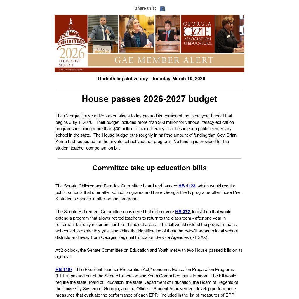 The Georgia House of Representatives today passed its version of the fiscal year budget that begins July 1, 2026. Their budget includes more than $60 million for various literacy education programs including more than $30 million to place literacy coaches in each public elementary school in the state. The House budget cuts roughly in half the amount of funding that Gov. Brian Kemp had requested for the private school voucher program. No funding is provided for the student teacher compensation bill.