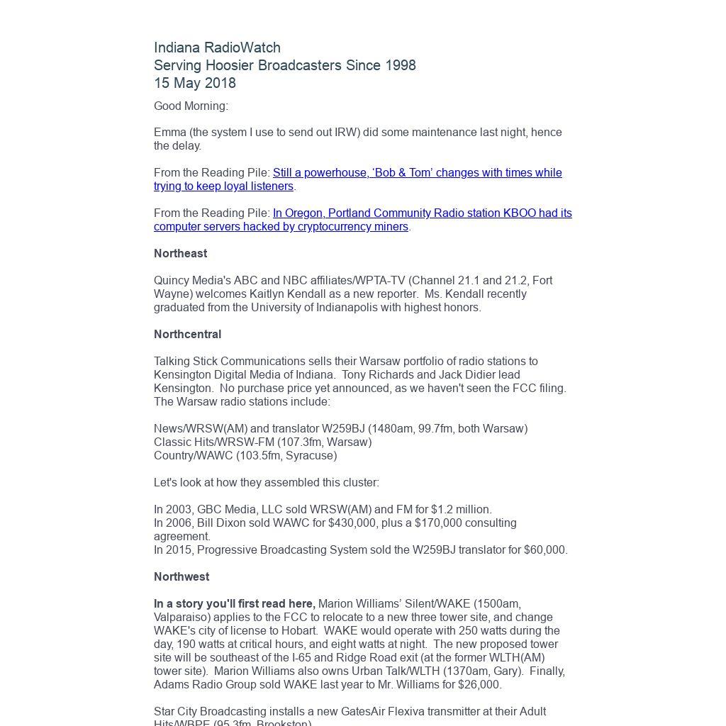 Indiana RadioWatch subscriptions are free. To subscribe, send an e-mail to irw@well.com and we'll add you. After publication, we archive Indiana RadioWatch on the Indiana Radio Archive at http://www.indianaradio.net. Please e-mail us your news stories and employment opportunities.