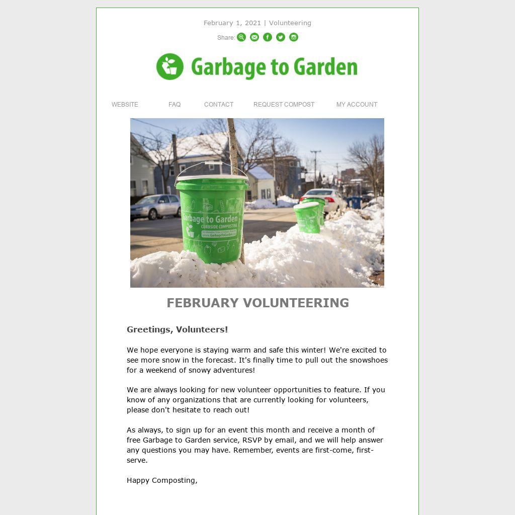 As always, to sign up for an event this month and receive a month of free Garbage to Garden service, RSVP by email, and we will help answer any questions you may have. Remember, events are first-come, first-serve.