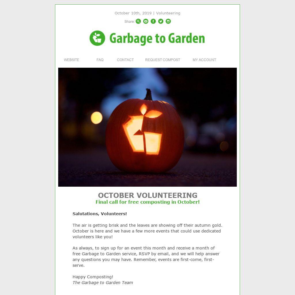 As always, to sign up for an event this month and receive a month of free Garbage to Garden service, RSVP by email, and we will help answer any questions you may have. Remember, events are first-come, first-serve.