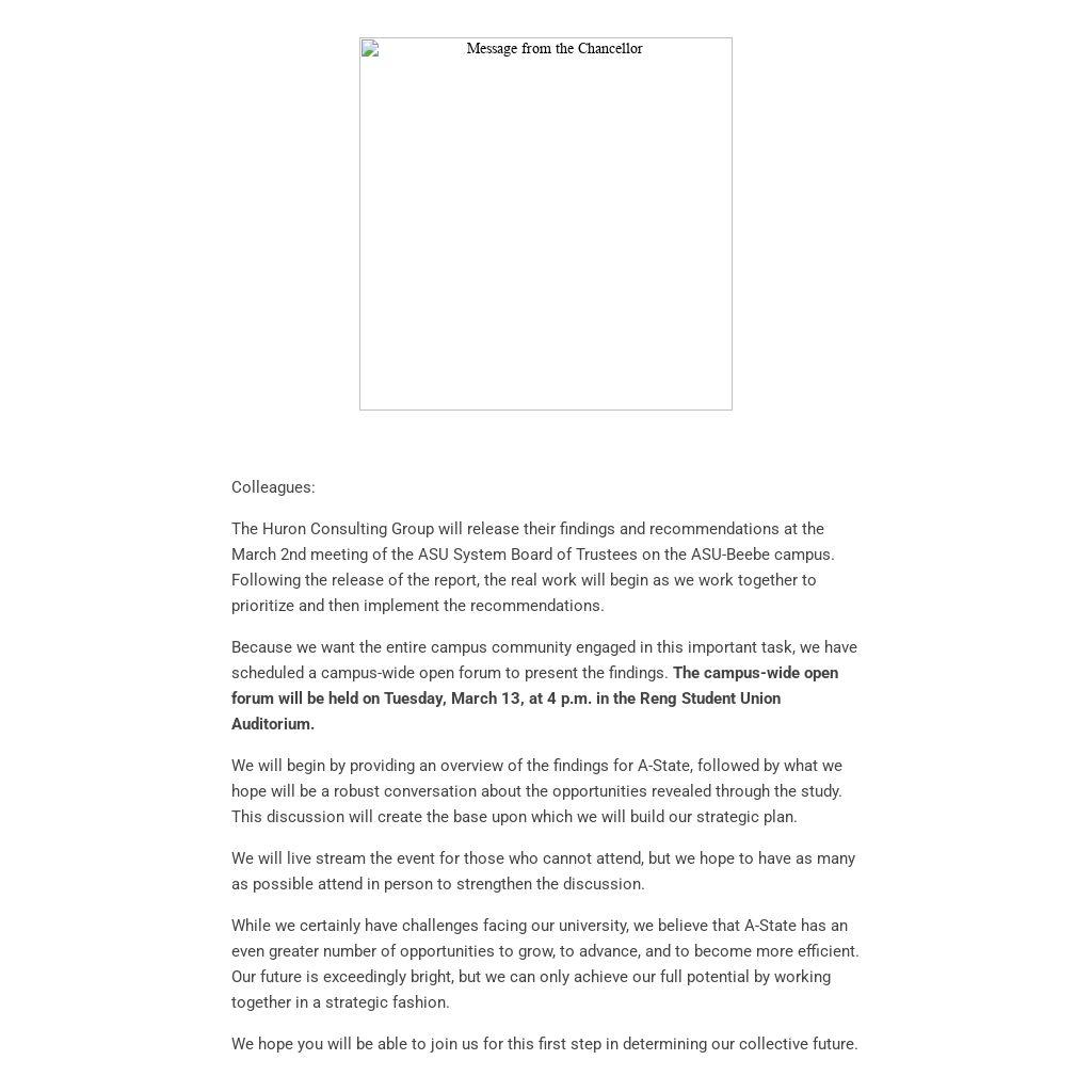 The Huron Consulting Group will release their findings and recommendations at the March 2nd meeting of the ASU System Board of Trustees on the ASU-Beebe campus. Following the release of the report, the real work will begin as we work together to prioritize and then implement the recommendations.
