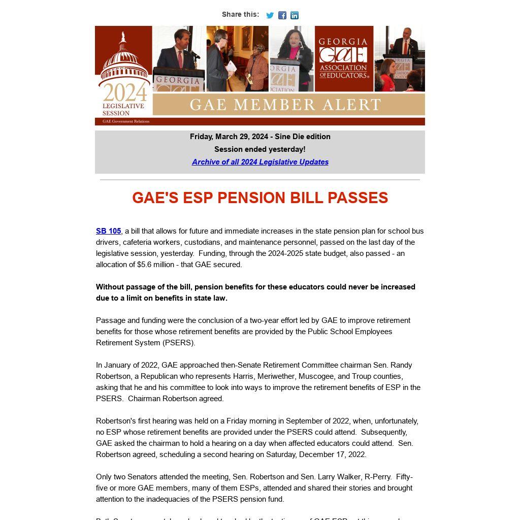SB 105, a bill that allows for future and immediate increases in the state pension plan for school bus drivers, cafeteria workers, custodians, and maintenance personnel, passed on the last day of the legislative session, yesterday. Funding, through the 2024-2025 state budget, also passed - an allocation of $5.6 million - that GAE secured.