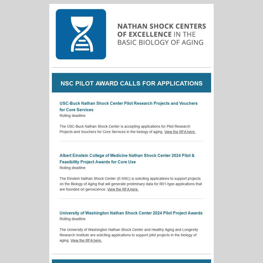 The University of Washington Nathan Shock Center and Healthy Aging and Longevity Research Institute are soliciting applications to support pilot projects in the biology of aging. View the RFA here.