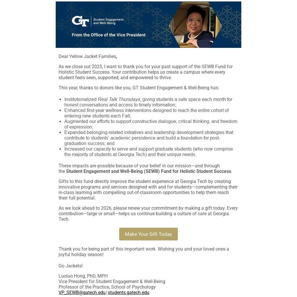 As we close out 2025, I want to thank you for your past support of the SEWB Fund for Holistic Student Success. Your contribution helps us create a campus where every student feels seen, supported, and empowered to thrive.
