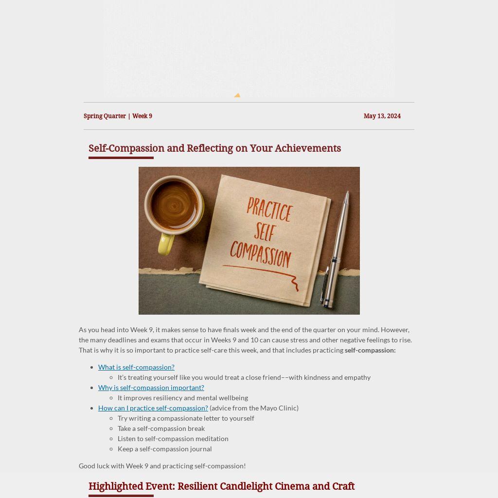 As you head into Week 9, it makes sense to have finals week and the end of the quarter on your mind. However, the many deadlines and exams that occur in Weeks 9 and 10 can cause stress and other negative feelings to rise. That is why it is so important to practice self-care this week, and that includes practicing self-compassion: