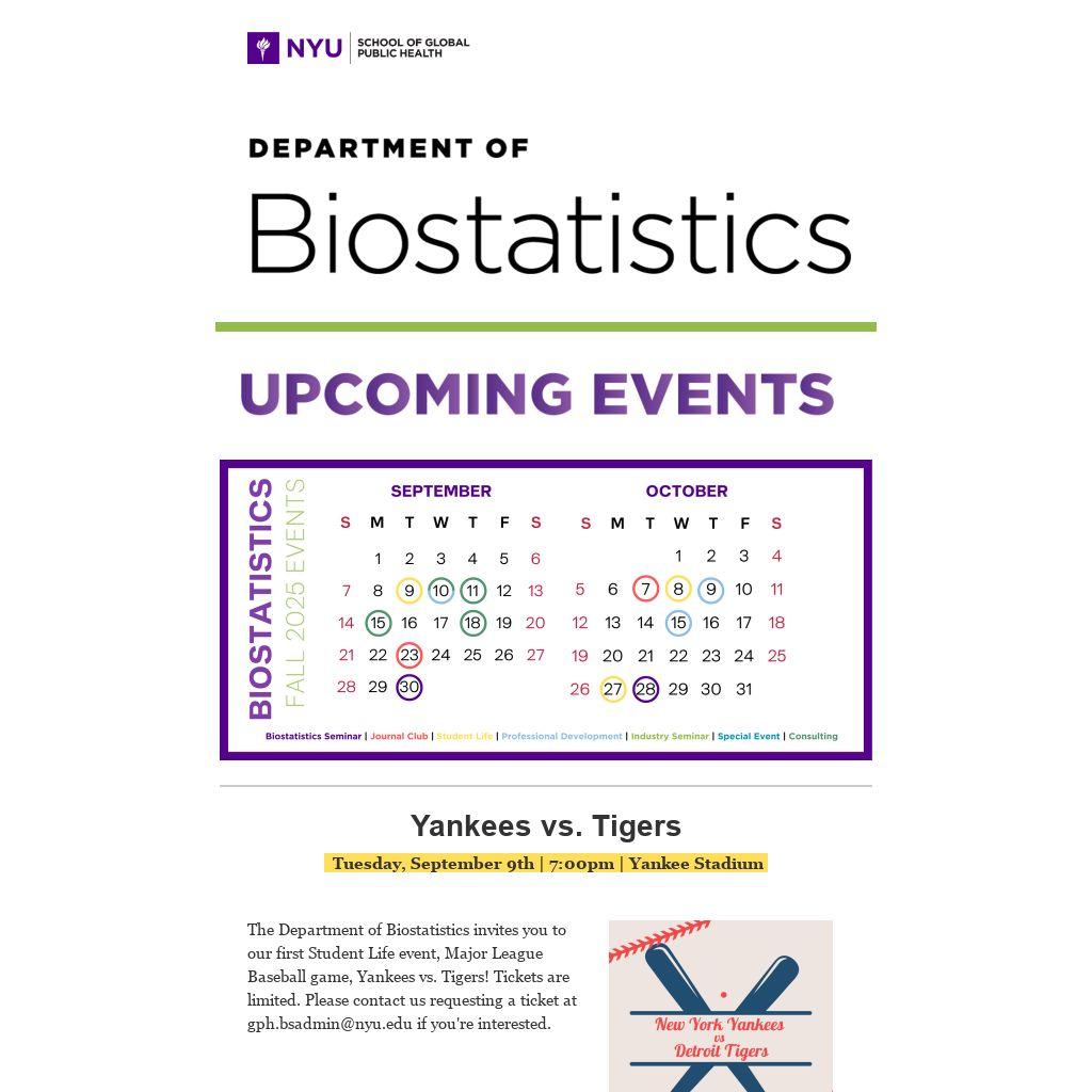 The Department of Biostatistics invites you to our first Student Life event, Major League Baseball game, Yankees vs. Tigers! Tickets are limited. Please contact us requesting a ticket at gph.bsadmin@nyu.edu if you're interested.