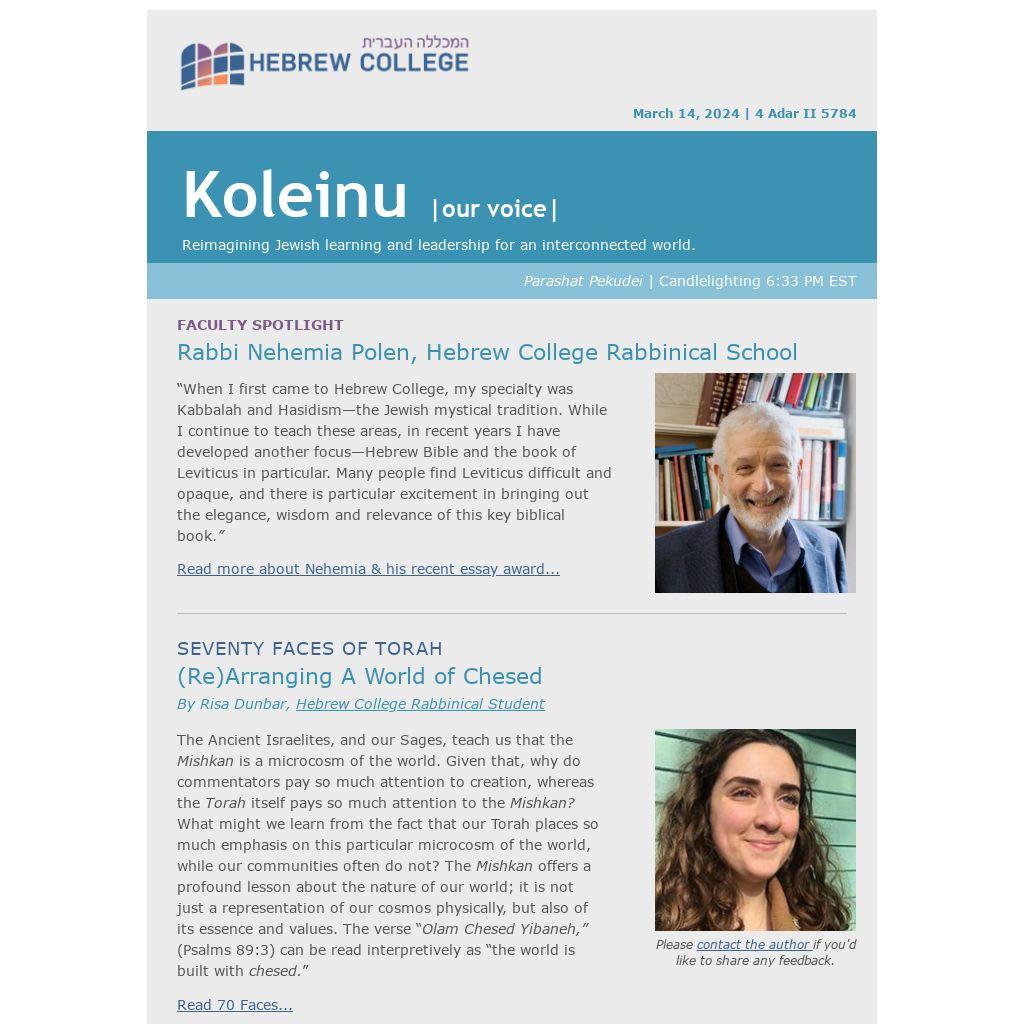Catch up on recent Hebrew College news and stories, including articles about faculty, students, and alumni who have been recognized for their work and scholarship. Read more...