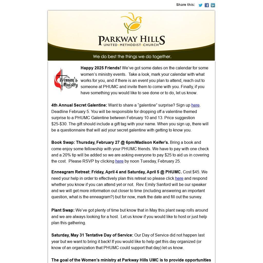 Happy 2025 Friends! We’ve got some dates on the calendar for some women’s ministry events. Take a look, mark your calendar with what works for you, and if there is an event you plan to attend, reach out to someone at PHUMC and invite them to come with you. Finally, if you have something you would like to see done or to do, let us know.