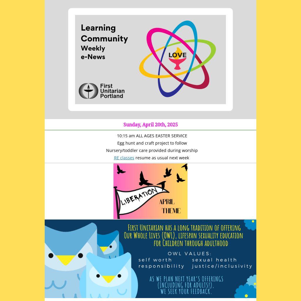 Thanks for showing up so enthusiastically last Sunday to support our YRUU youth, who gifted us with a beautiful worship experience about liberation. You can view it here. The service included two excellent homilies, an original composition on piano, and many other meaningful moments. As the youth shared, they welcome anyone who wishes to be in touch with them to email me. I’ll be sure to pass along any messages.