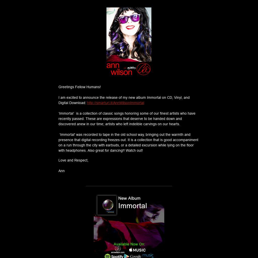 I am excited to announce the release of my new album Immortal on CD, Vinyl, and Digital Download: http://smarturl.it/AnnWilsonImmortal