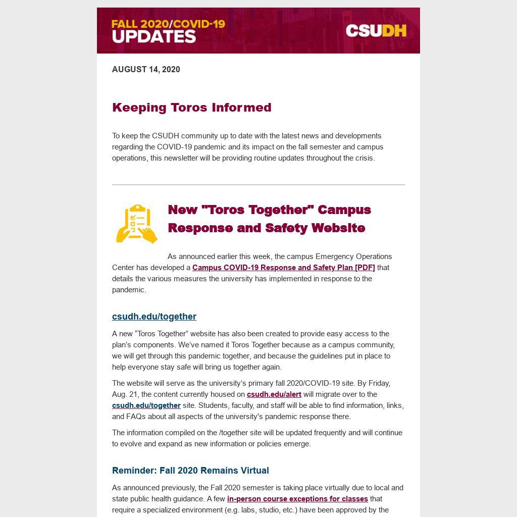 The website will serve as the university’s primary fall 2020/COVID-19 site. By Friday, Aug. 21, the content currently housed on csudh.edu/alert will migrate over to the csudh.edu/together site. Students, faculty, and staff will be able to find information, links, and FAQs about all aspects of the university's pandemic response there.
