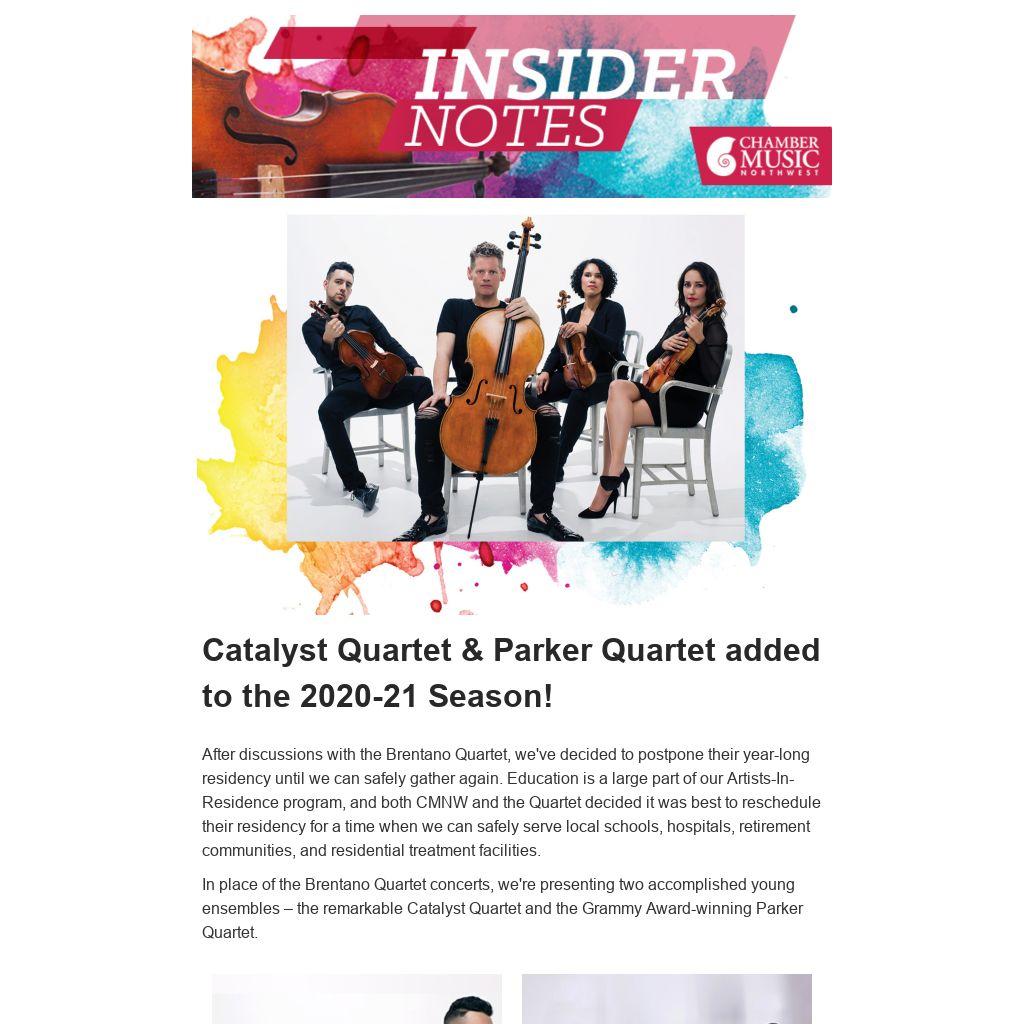 In place of the Brentano Quartet concerts, we're presenting two accomplished young ensembles – the remarkable Catalyst Quartet and the Grammy Award-winning Parker Quartet.