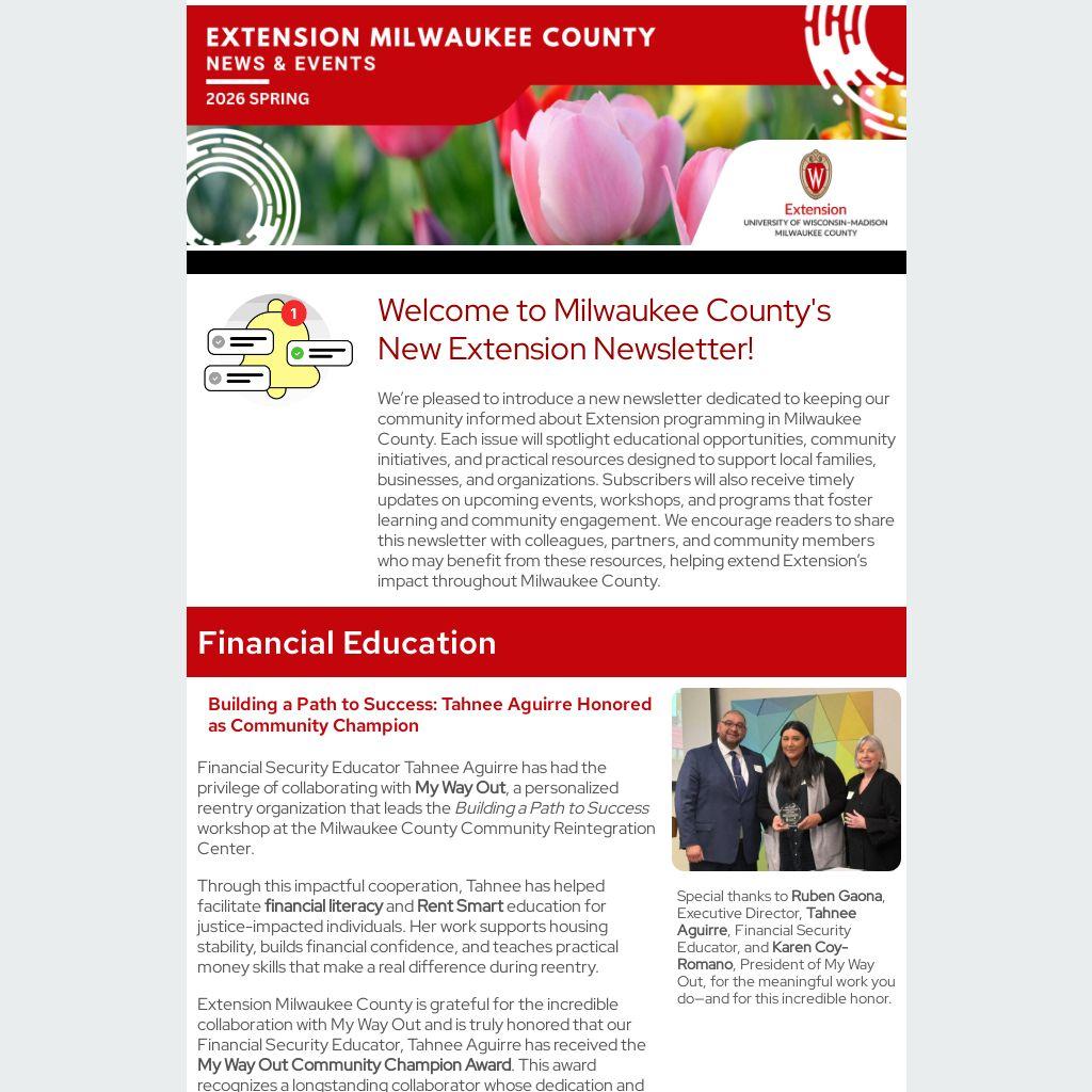 We’re pleased to introduce a new newsletter dedicated to keeping our community informed about Extension programming in Milwaukee County. Each issue will spotlight educational opportunities, community initiatives, and practical resources designed to support local families, businesses, and organizations. Subscribers will also receive timely updates on upcoming events, workshops, and programs that foster learning and community engagement. We encourage readers to share this newsletter with colleagues, partners, and community members who may benefit from these resources, helping extend Extension’s impact throughout Milwaukee County.