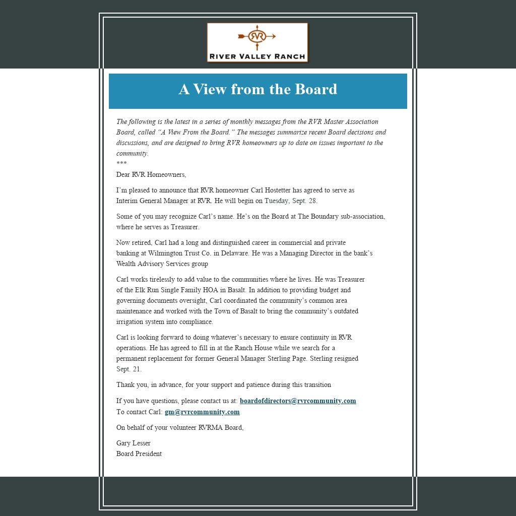 I’m pleased to announce that RVR homeowner Carl Hostetter has agreed to serve as