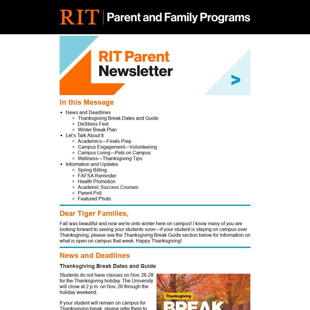 Fall was beautiful and now we're onto winter here on campus! I know many of you are looking forward to seeing your students soon—if your student is staying on campus over Thanksgiving, please see the Thanksgiving Break Guide section below for information on what is open on campus that week. Happy Thanksgiving!