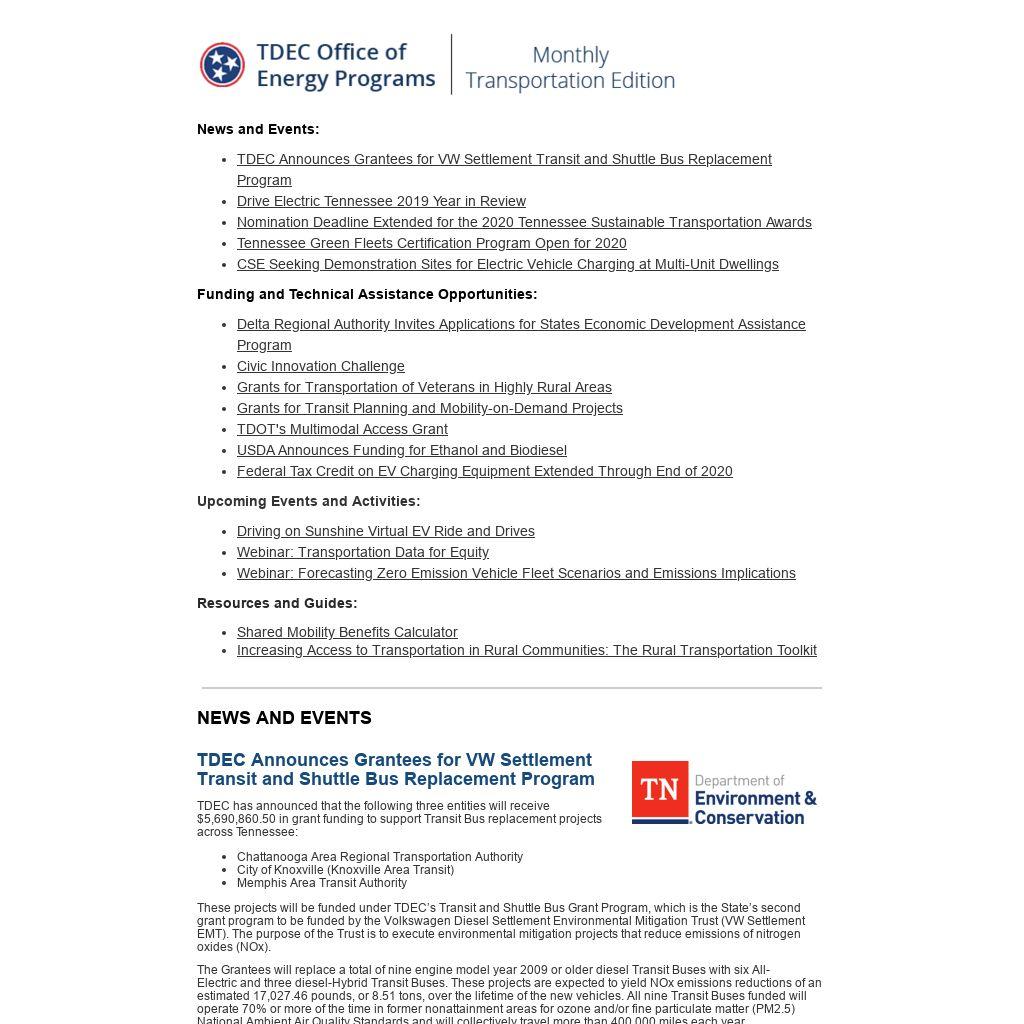 | TDEC Announces Grantees for VW Settlement Transit and Shuttle Bus Replacement Program