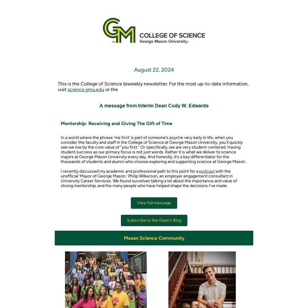 In a world where the phrase ‘me first’ is part of someone’s psyche very early in life, when you consider the faculty and staff in the College of Science at George Mason University, you’ll quickly see we live by the core value of “you first.” Or specifically, we are very student-centered. Having student success as our primary focus is not just words. Rather it is what we deliver to science majors at George Mason University every day. And honestly, it’s a key differentiator for the thousands of students and alumni who choose exploring and supporting science at George Mason.