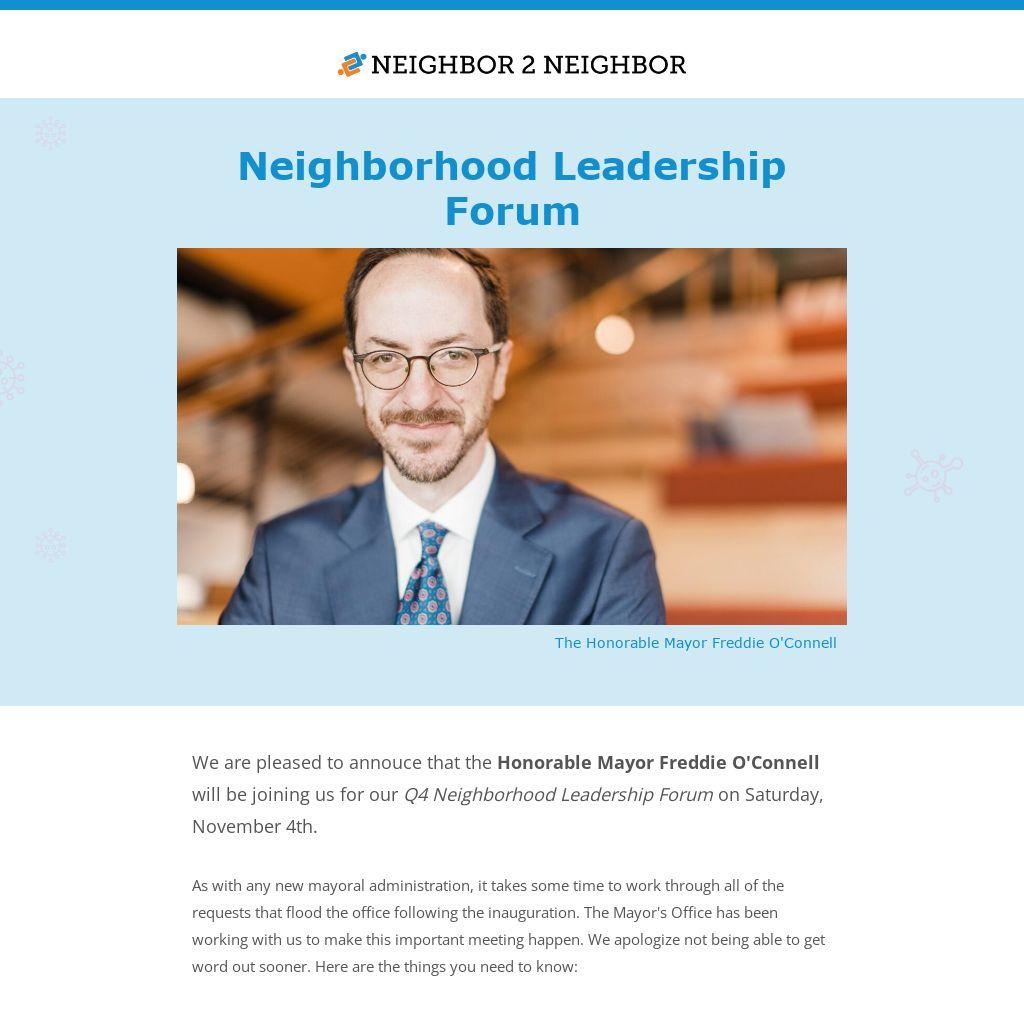 We are pleased to annouce that the Honorable Mayor Freddie O'Connell will be joining us for our Q4 Neighborhood Leadership Forum on Saturday, November 4th.