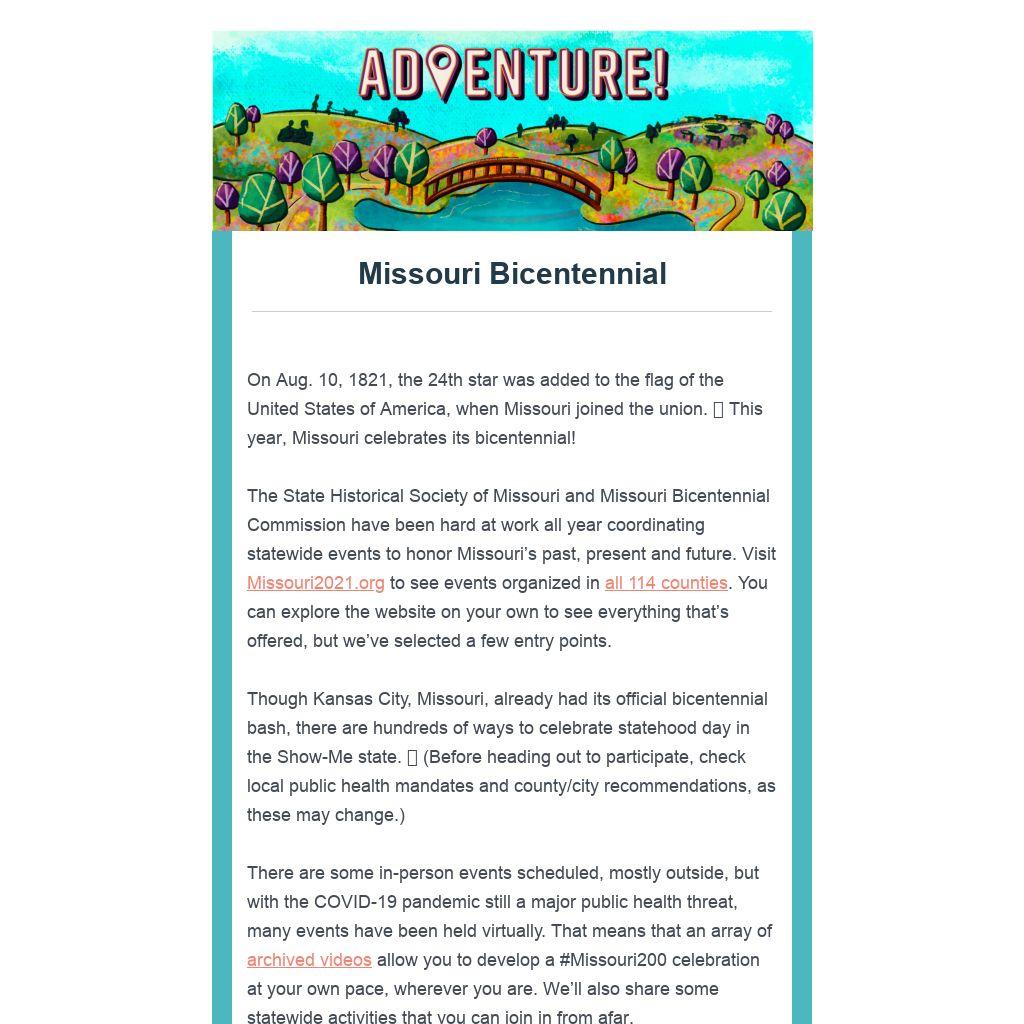 Though Kansas City, Missouri, already had its official bicentennial bash, there are hundreds of ways to celebrate statehood day in the Show-Me state. 🥳 (Before heading out to participate, check local public health mandates and county/city recommendations, as these may change.) There are some in-person events scheduled, mostly outside, but with the COVID-19 pandemic still a major public health threat, many events have been held virtually. That means that an array of archived videos allow you to develop a #Missouri200 celebration at your own pace, wherever you are. We’ll also share some statewide activities that you can join in from afar.