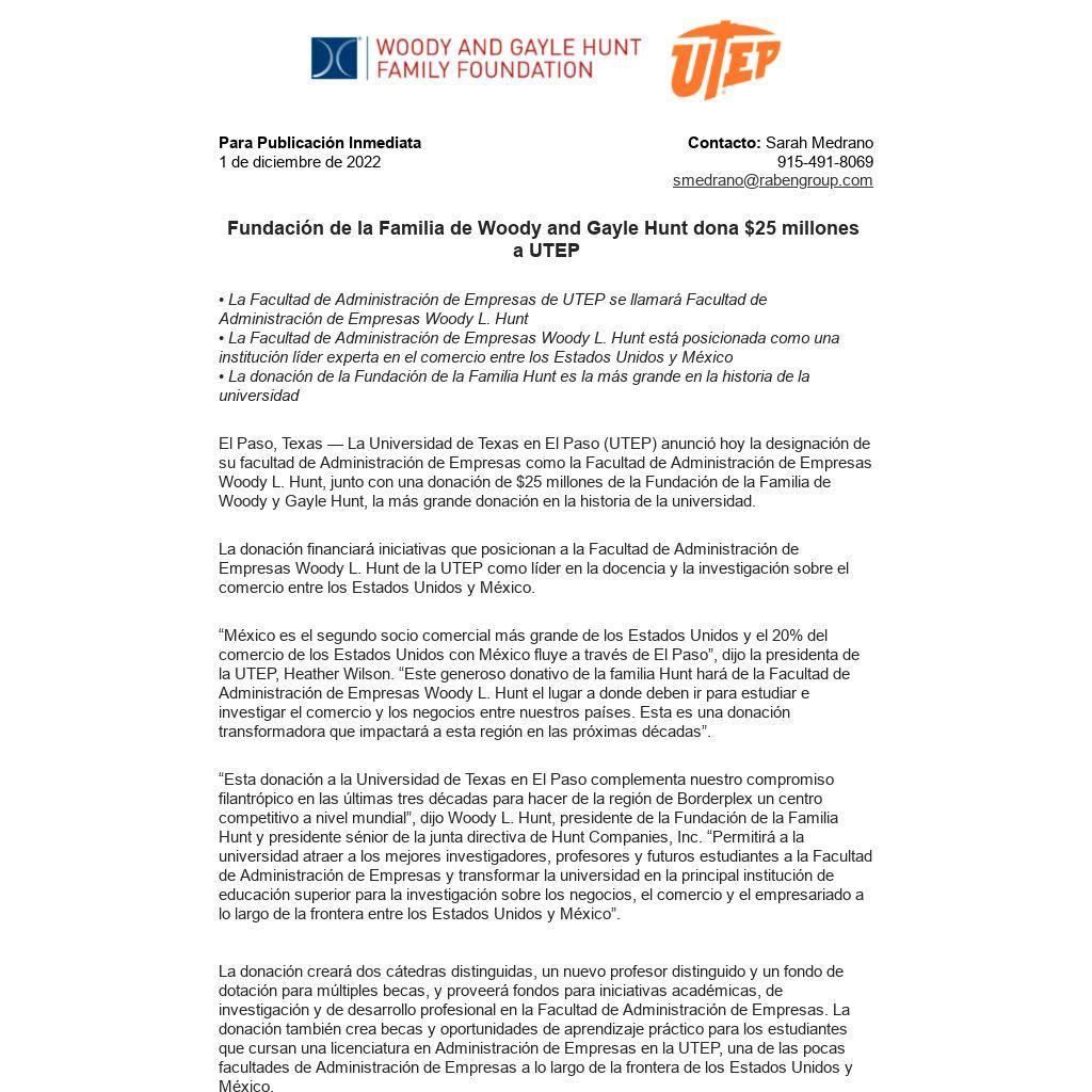 “Estamos muy agradecidos con la familia Hunt por esta donación, que creará nuevas oportunidades para que nuestros estudiantes de administración de empresas se beneficien de la ubicación única de la UTEP, que nos coloca en el corazón del comercio entre los Estados Unidos y México”, dijo James E. Payne, PhD., decano de la Facultad de Administración de Empresas Woody L. Hunt. “En nombre de nuestros 3,193 estudiantes, 134 profesores y personal, y 24,049 ex alumnos, la facultad tiene el honor de estar asociada a los logros empresariales y filantrópicos de Woody L. Hunt”.