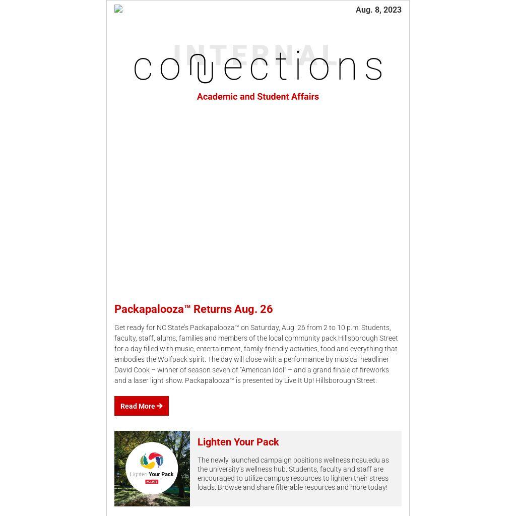 Get ready for NC State’s Packapalooza™ on Saturday, Aug. 26 from 2 to 10 p.m. Students, faculty, staff, alums, families and members of the local community pack Hillsborough Street for a day filled with music, entertainment, family-friendly activities, food and everything that embodies the Wolfpack spirit. The day will close with a performance by musical headliner David Cook – winner of season seven of “American Idol” – and a grand finale of fireworks and a laser light show. Packapalooza™ is presented by Live It Up! Hillsborough Street.