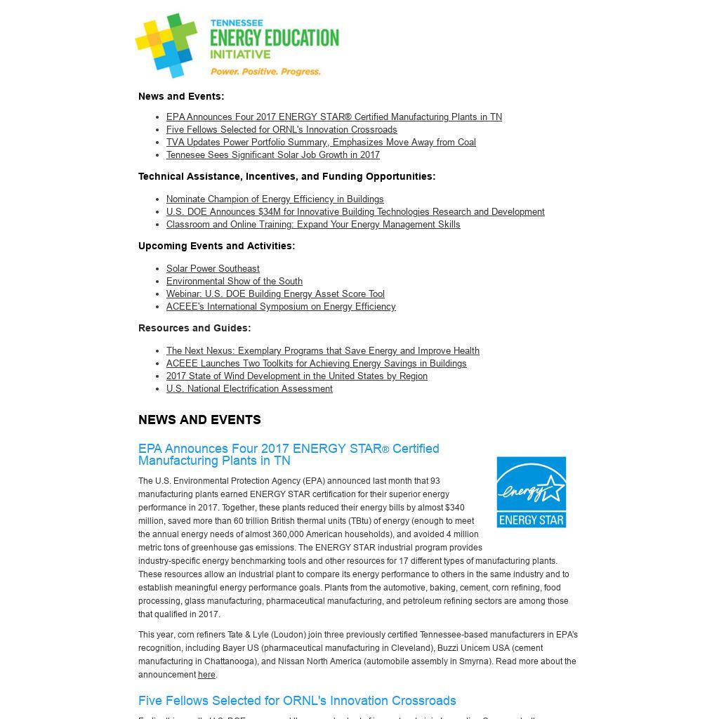 The U.S. Environmental Protection Agency (EPA) announced last month that 93 manufacturing plants earned ENERGY STAR certification for their superior energy performance in 2017. Together, these plants reduced their energy bills by almost $340 million, saved more than 60 trillion British thermal units (TBtu) of energy (enough to meet the annual energy needs of almost 360,000 American households), and avoided 4 million metric tons of greenhouse gas emissions. The ENERGY STAR industrial program provides industry-specific energy benchmarking tools and other resources for 17 different types of manufacturing plants. These resources allow an industrial plant to compare its energy performance to others in the same industry and to establish meaningful energy performance goals. Plants from the automotive, baking, cement, corn refining, food processing, glass manufacturing, pharmaceutical manufacturing, and petroleum refining sectors are among those that qualified in 2017. This year, corn refiners Tate & Lyle (Loudon) join three previously certified Tennessee-based manufacturers in EPA’s recognition, including Bayer US (pharmaceutical manufacturing in Cleveland), Buzzi Unicem USA (cement manufacturing in Chattanooga), and Nissan North America (automobile assembly in Smyrna). Read more about the announcement here.