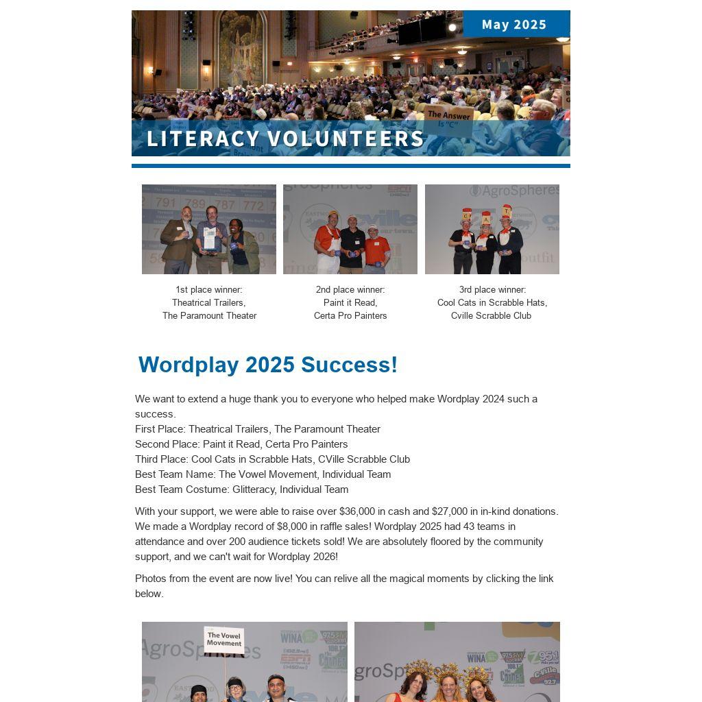 With your support, we were able to raise over $36,000 in cash and $27,000 in in-kind donations. We made a Wordplay record of $8,000 in raffle sales! Wordplay 2025 had 43 teams in attendance and over 200 audience tickets sold! We are absolutely floored by the community support, and we can't wait for Wordplay 2026!