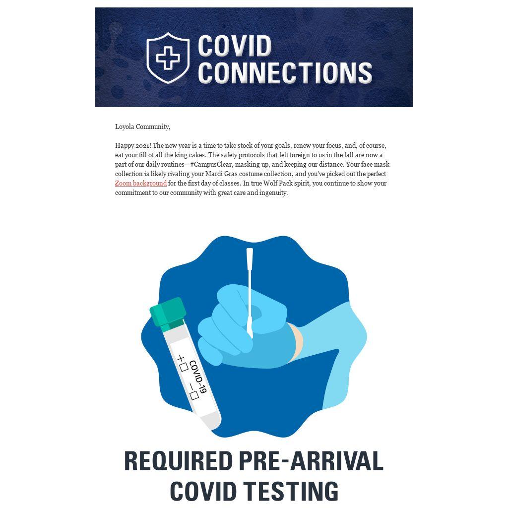 We are providing free COVID-19 testing to Loyola community members (students, faculty, and staff) available today, January 15, and January 22 from 9 a.m. – 5 p.m. on the first floor of Mercy Hall (click the map to expand). You must present your Loyola ID for access.Â