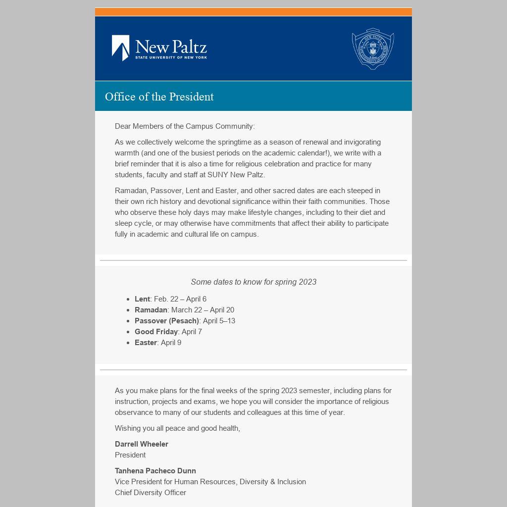 As we collectively welcome the springtime as a season of renewal and invigorating warmth (and one of the busiest periods on the academic calendar!), we write with a brief reminder that it is also a time for religious celebration and practice for many students, faculty and staff at SUNY New Paltz.