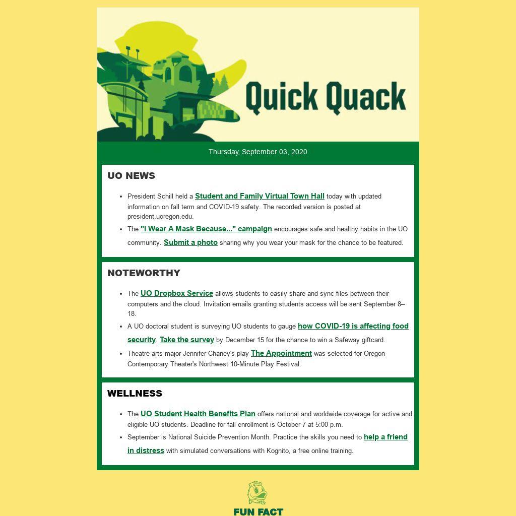 President Schill held a Student and Family Virtual Town Hall today with updated information on fall term and COVID-19 safety. The recorded version is posted at president.uoregon.edu.