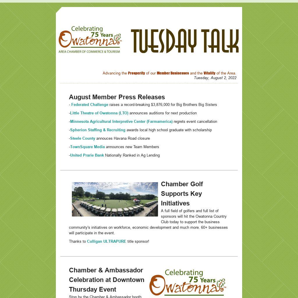 We’ll show them around town, and share the capabilities of our community to be a great host for them and their events! RSVP here by August 5 (https://visitowatonna.org/rsvp/). Space is limited so make sure to pass along this invite, and have them sign up today! If you have any questions, please contact Glenda Smith- gsmith@owatonna.org or 507-451-7970.