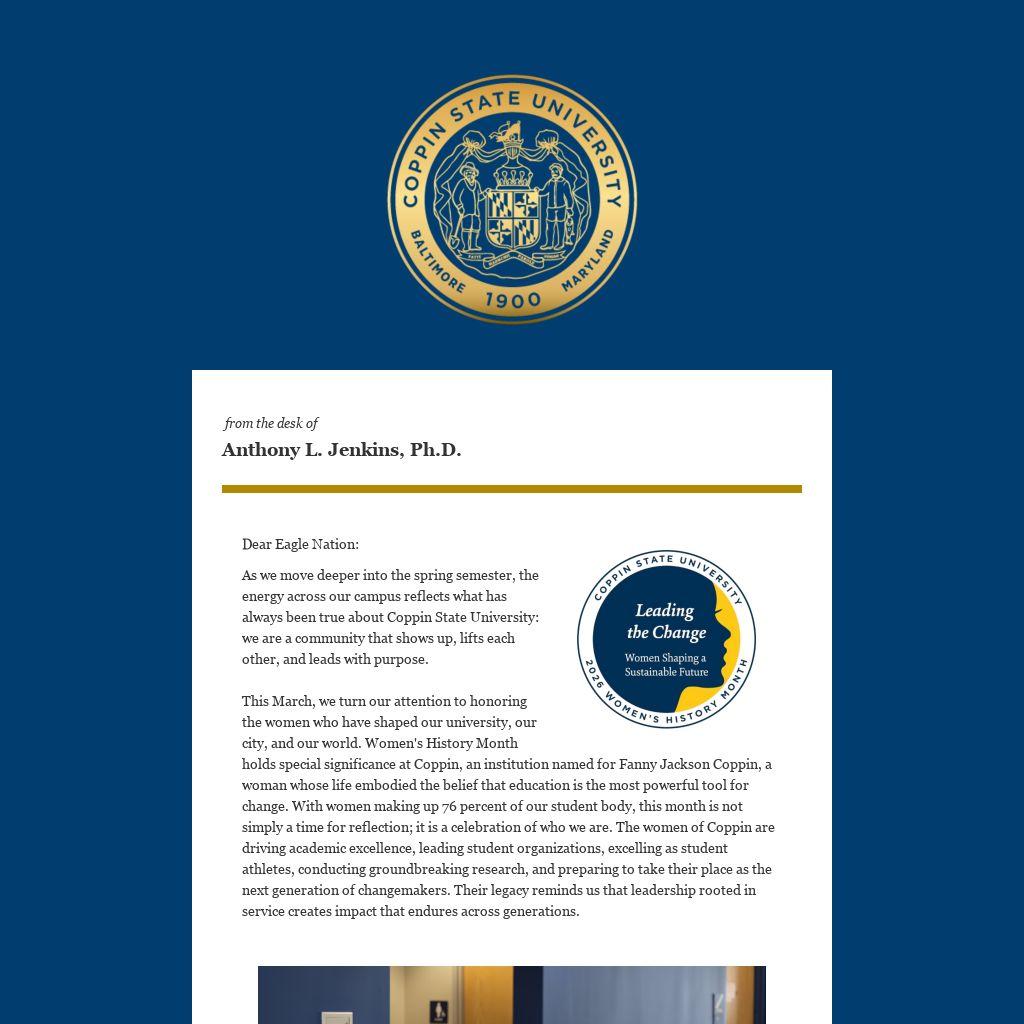 This March, we turn our attention to honoring the women who have shaped our university, our city, and our world. Women's History Month holds special significance at Coppin, an institution named for Fanny Jackson Coppin, a woman whose life embodied the belief that education is the most powerful tool for change. With women making up 76 percent of our student body, this month is not simply a time for reflection; it is a celebration of who we are. The women of Coppin are driving academic excellence, leading student organizations, excelling as student athletes, conducting groundbreaking research, and preparing to take their place as the next generation of changemakers. Their legacy reminds us that leadership rooted in service creates impact that endures across generations.