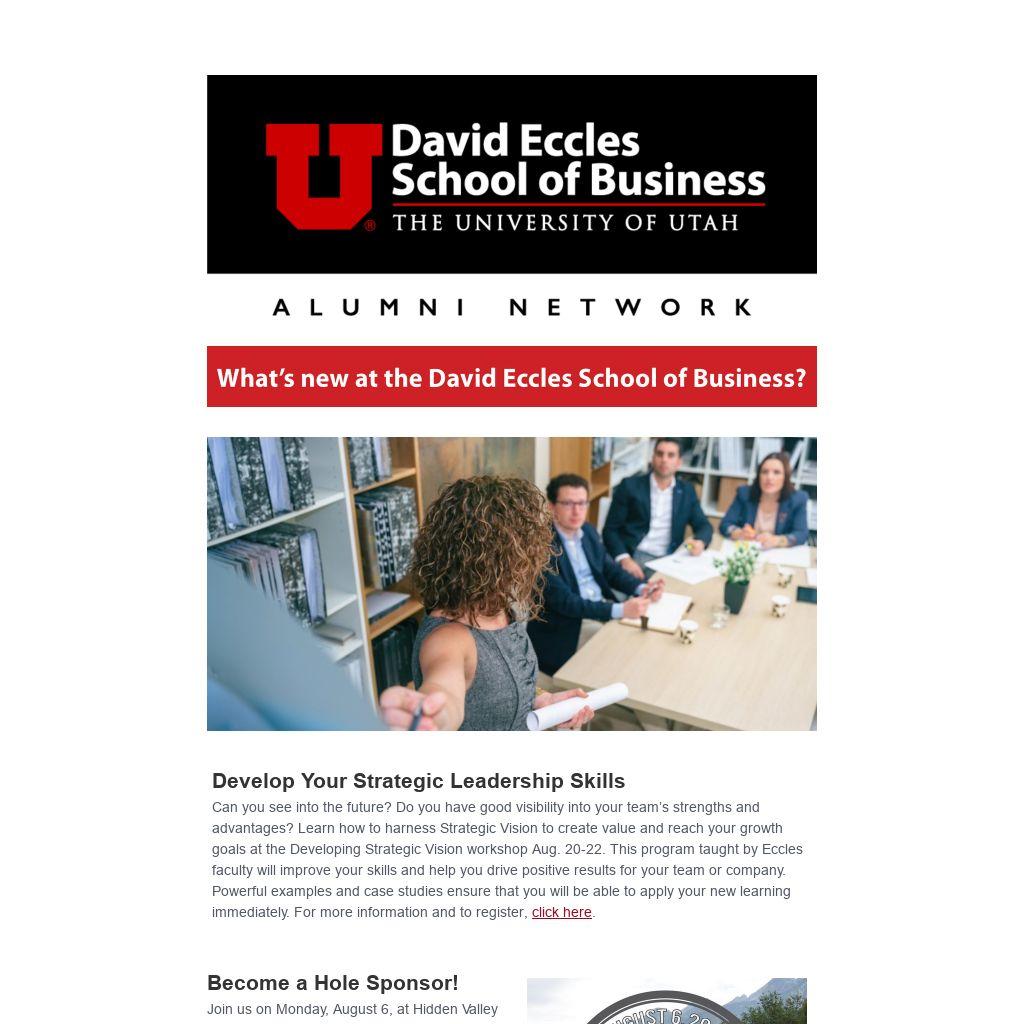 Can you see into the future? Do you have good visibility into your team’s strengths and advantages? Learn how to harness Strategic Vision to create value and reach your growth goals at the Developing Strategic Vision workshop Aug. 20-22. This program taught by Eccles faculty will improve your skills and help you drive positive results for your team or company. Powerful examples and case studies ensure that you will be able to apply your new learning immediately. For more information and to register,