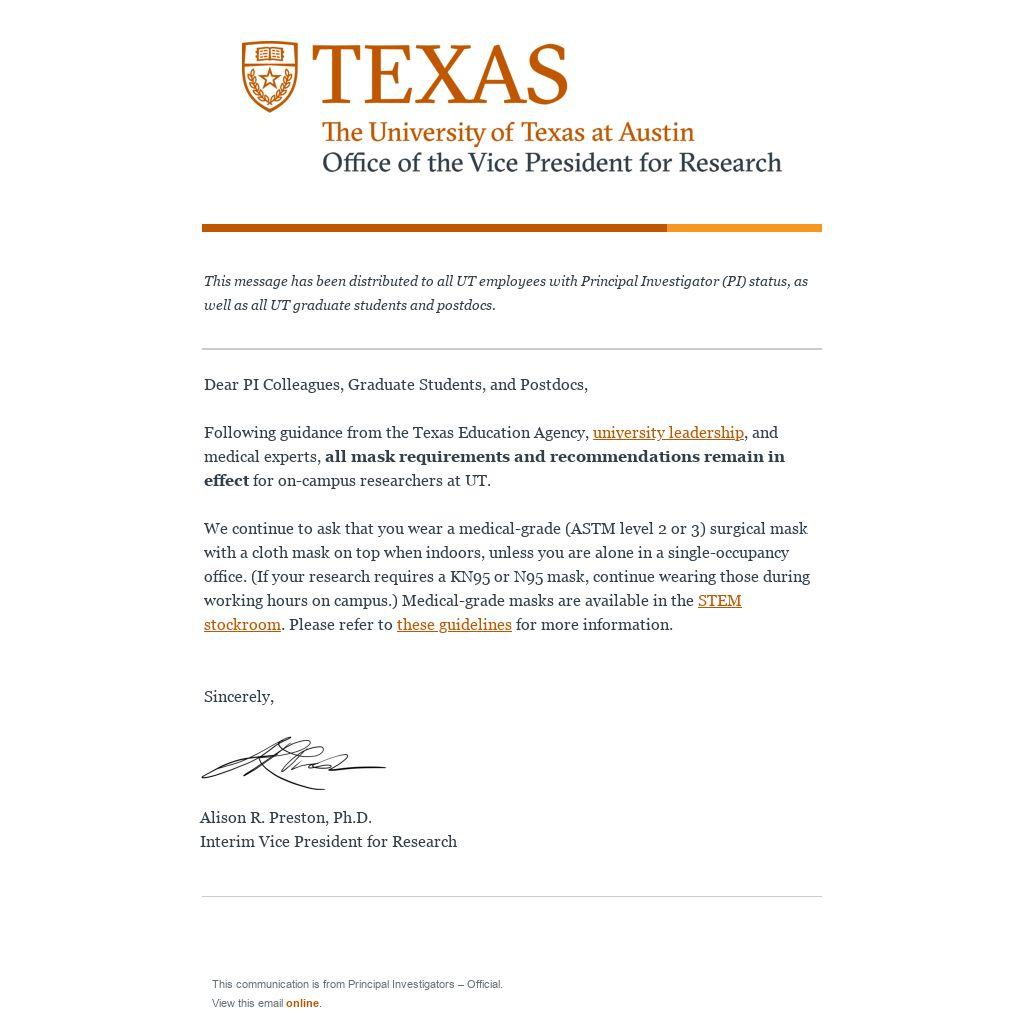 This message has been distributed to all UT employees with Principal Investigator (PI) status, as well as all UT graduate students and postdocs.