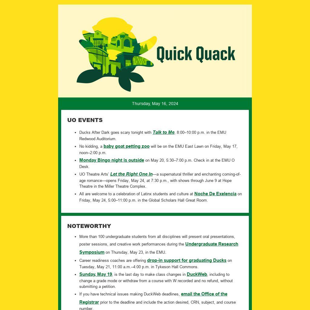 - Ducks After Dark goes scary tonight with Talk to Me, 8:00–10:00 p.m. in the EMU Redwood Auditorium.