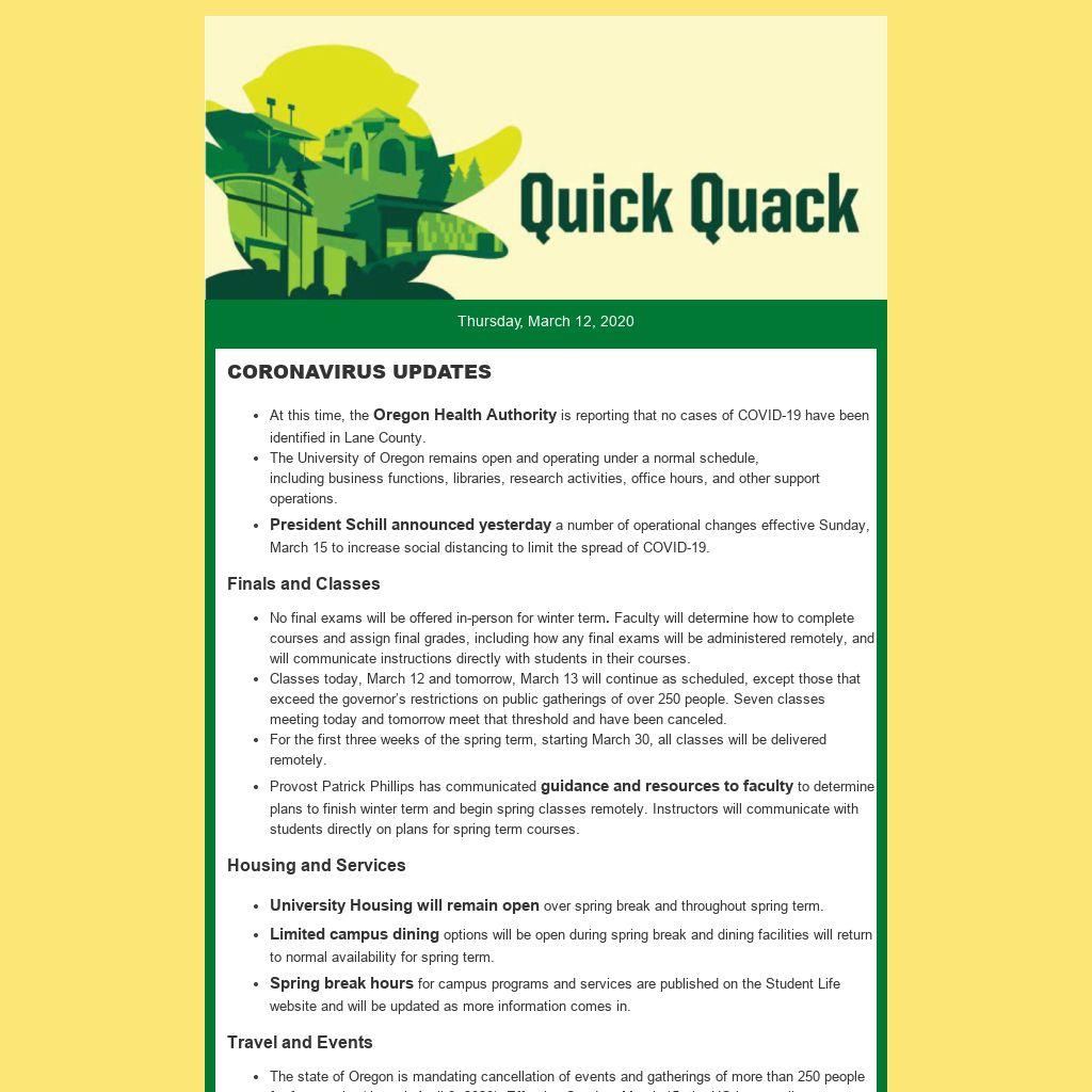 The UO Coronavirus webpage is being continually updated and is the best source for information on campus response to COVID-19.