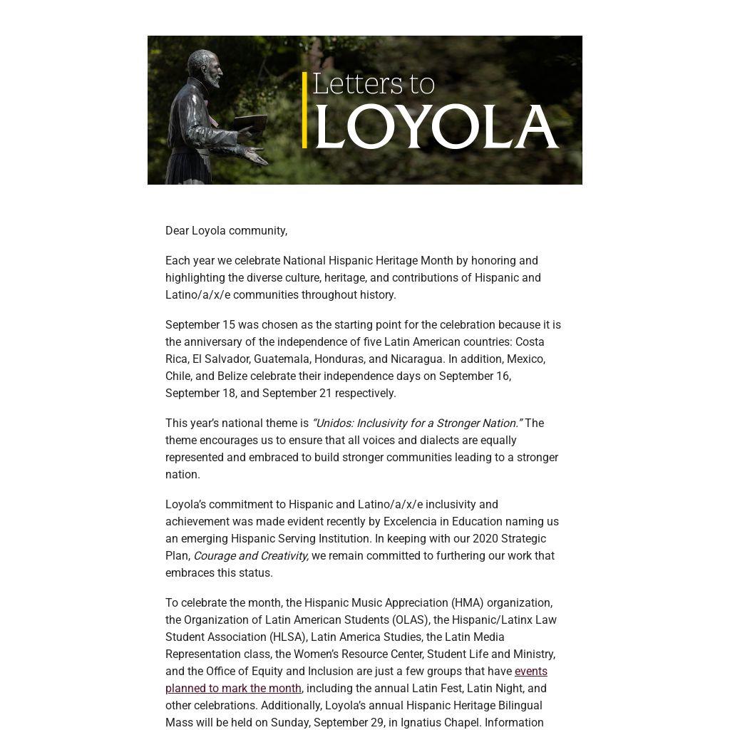 As we celebrate this wonderful month, let’s remember that each of us can contribute to Loyola’s effort to become a more equitable, inclusive, and anti-racist university. And I urge each of us to find ways to support, serve and uplift our Hispanic and Latino/a/x/e students, faculty, staff, and neighbors in the greater community.