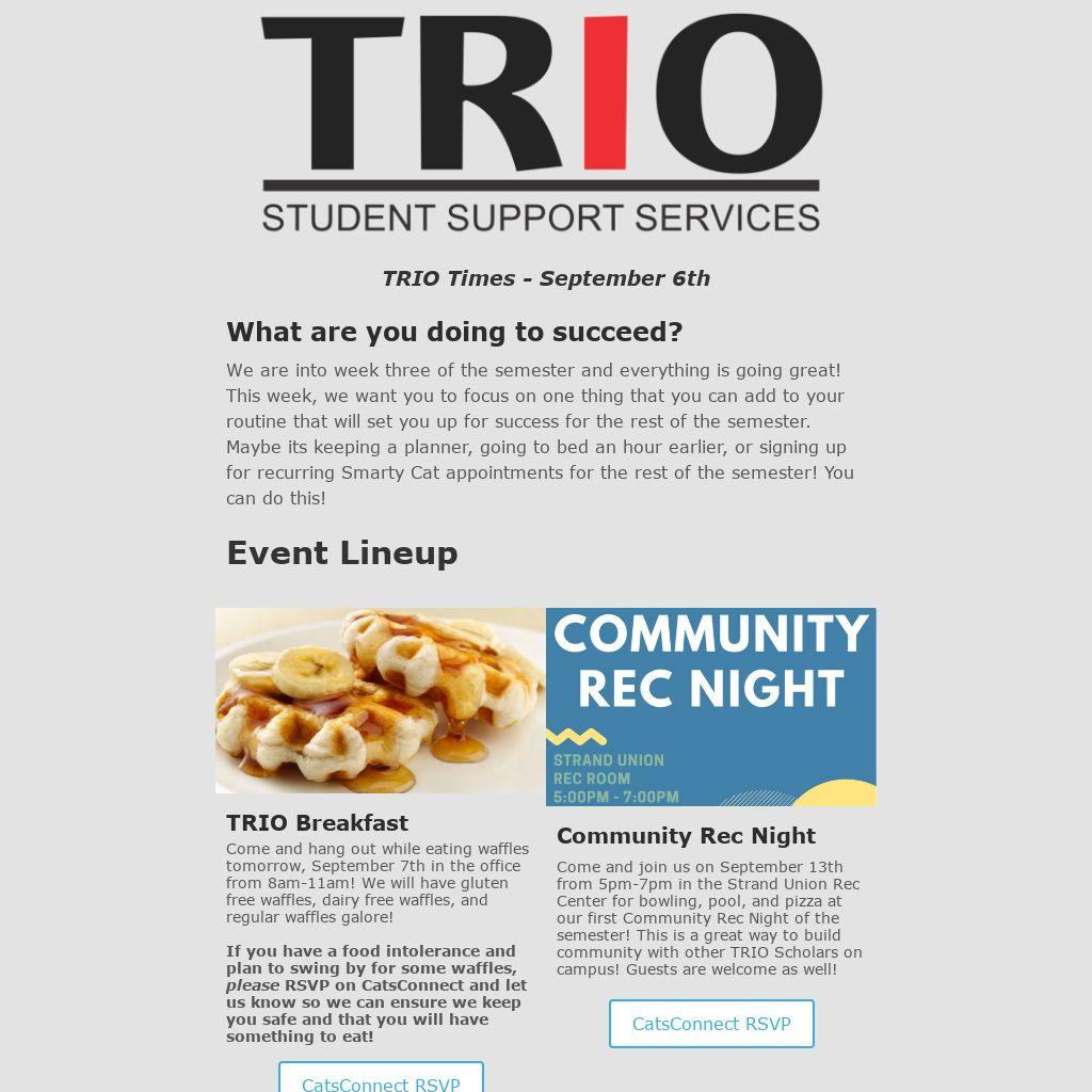 Come and join us on September 13th from 5pm-7pm in the Strand Union Rec Center for bowling, pool, and pizza at our first Community Rec Night of the semester! This is a great way to build community with other TRIO Scholars on campus! Guests are welcome as well!