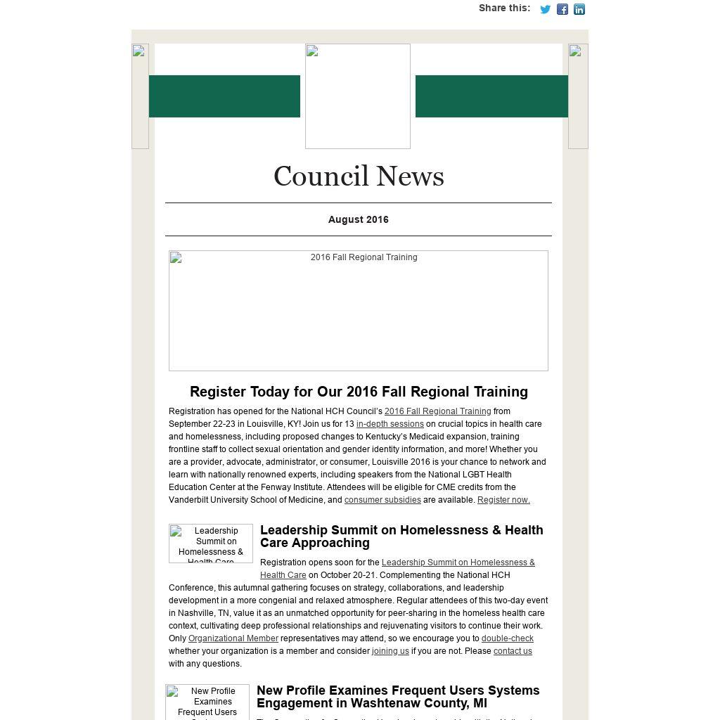 Registration has opened for the National HCH Council’s 2016 Fall Regional Training from September 22-23 in Louisville, KY! Join us for 13 in-depth sessions on crucial topics in health care and homelessness, including proposed changes to Kentucky’s Medicaid expansion, training frontline staff to collect sexual orientation and gender identity information, and more! Whether you are a provider, advocate, administrator, or consumer, Louisville 2016 is your chance to network and learn with nationally renowned experts, including speakers from the National LGBT Health Education Center at the Fenway Institute. Attendees will be eligible for CME credits from the Vanderbilt University School of Medicine, and consumer subsidies are available. Register now.