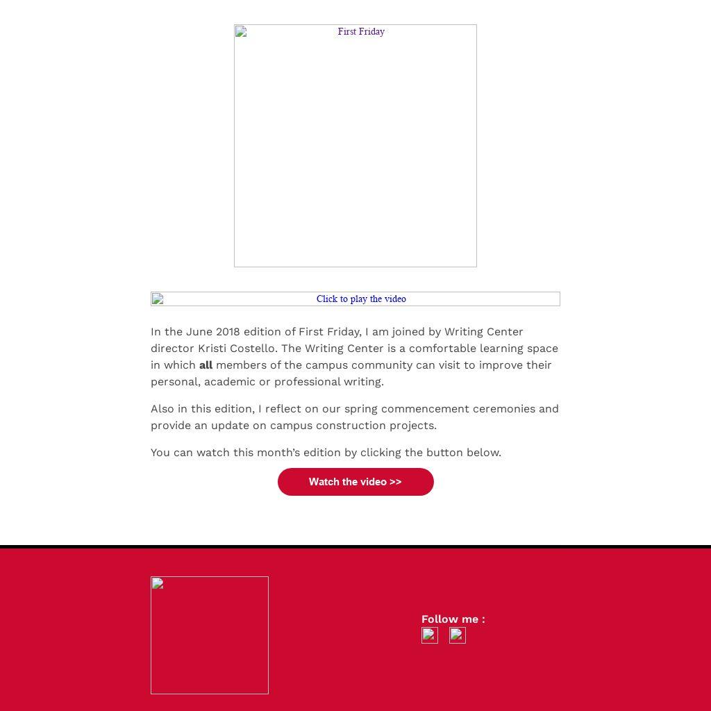 In the June 2018 edition of First Friday, I am joined by Writing Center director Kristi Costello. The Writing Center is a comfortable learning space in which all members of the campus community can visit to improve their personal, academic or professional writing.