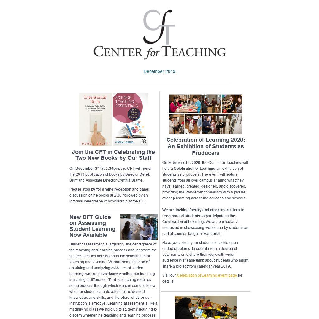 Each year the Center for Teaching (CFT) hires a number of graduate students as part of its efforts to mentor and train graduate students, including those serving as teaching assistants or instructors of record here at Vanderbilt as well as those interested in developing teaching skills for future faculty careers. The CFT has several types of positions available for graduate students for the 2020-2021 academic year.
