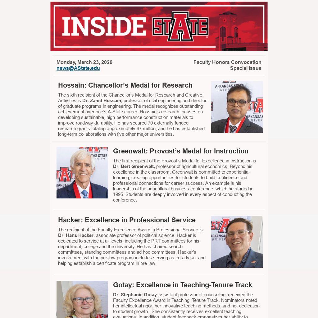 The sixth recipient of the Chancellor’s Medal for Research and Creative Activities is Dr. Zahid Hossain, professor of civil engineering and director of graduate programs in engineering. The medal recognizes outstanding achievement over one’s A-State career. Hossain's research focuses on developing sustainable, high-performance construction materials to improve roadway durability. He has secured 70 externally funded research grants totaling approximately $7 million, and he has established long-term collaborations with five other major universities.