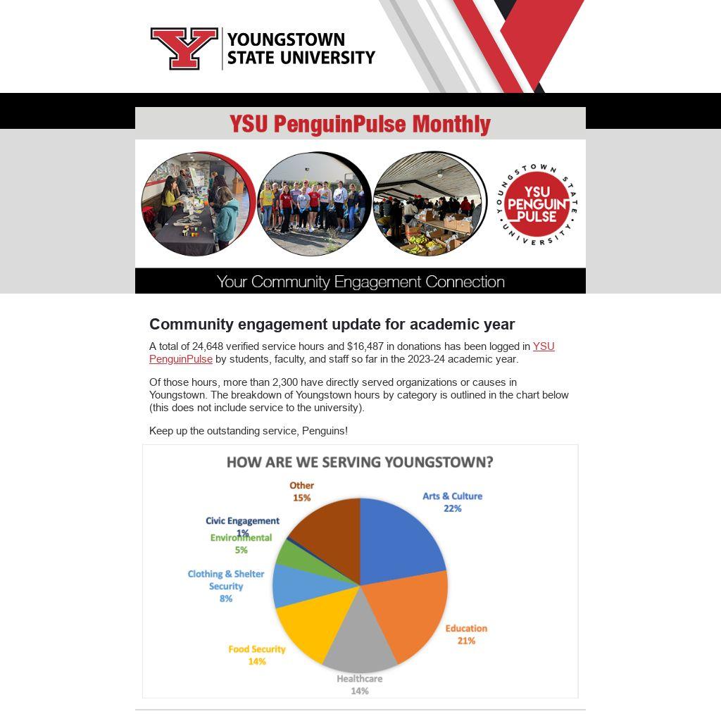 A total of 24,648 verified service hours and $16,487 in donations has been logged in YSU PenguinPulse by students, faculty, and staff so far in the 2023-24 academic year.